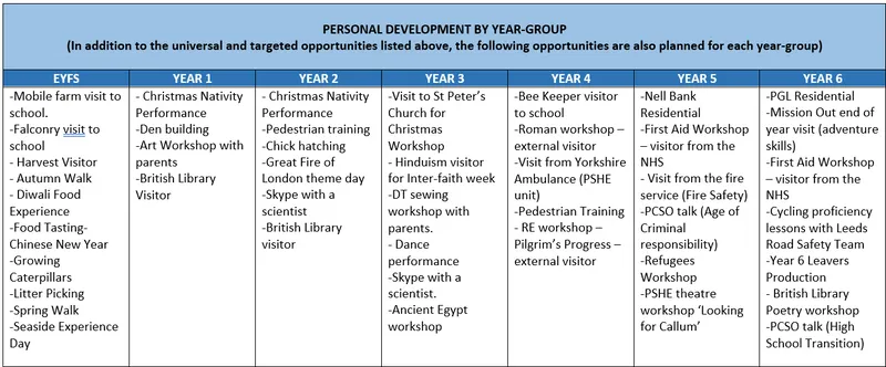 In addition to the universal offer and targeted support, we also offer additional opportunities for each year-group linked to their curriculum areas